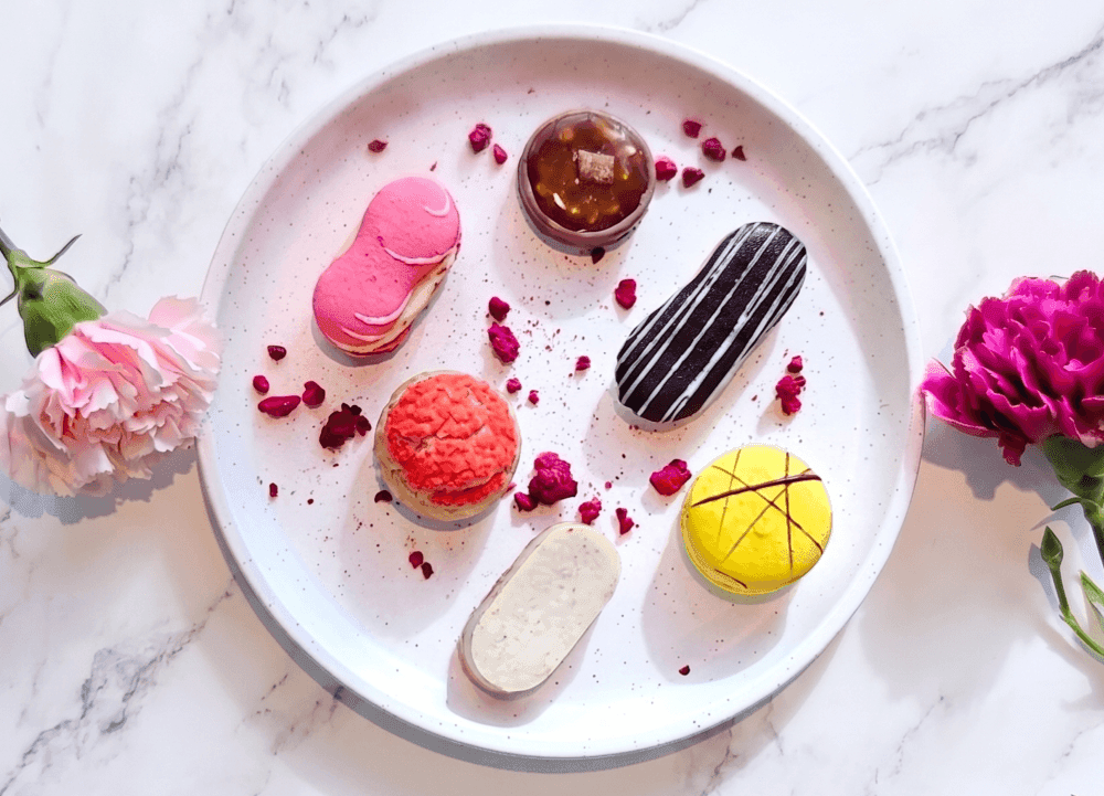 Indulge in our delicate six peice serving selection including Banana Cheesecake, Caramel Almond Les Passion Tartes, Raspberry Chous Chous. Vanilla and Raspberry Eclairon, Lemon Macaron and Chocolate Les Carolines.